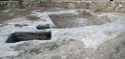 Picture: Ancient wine press, south of Hebron mountain. On the right is the treading pit; in the middle is the precipitation pit; the vat is on the left.